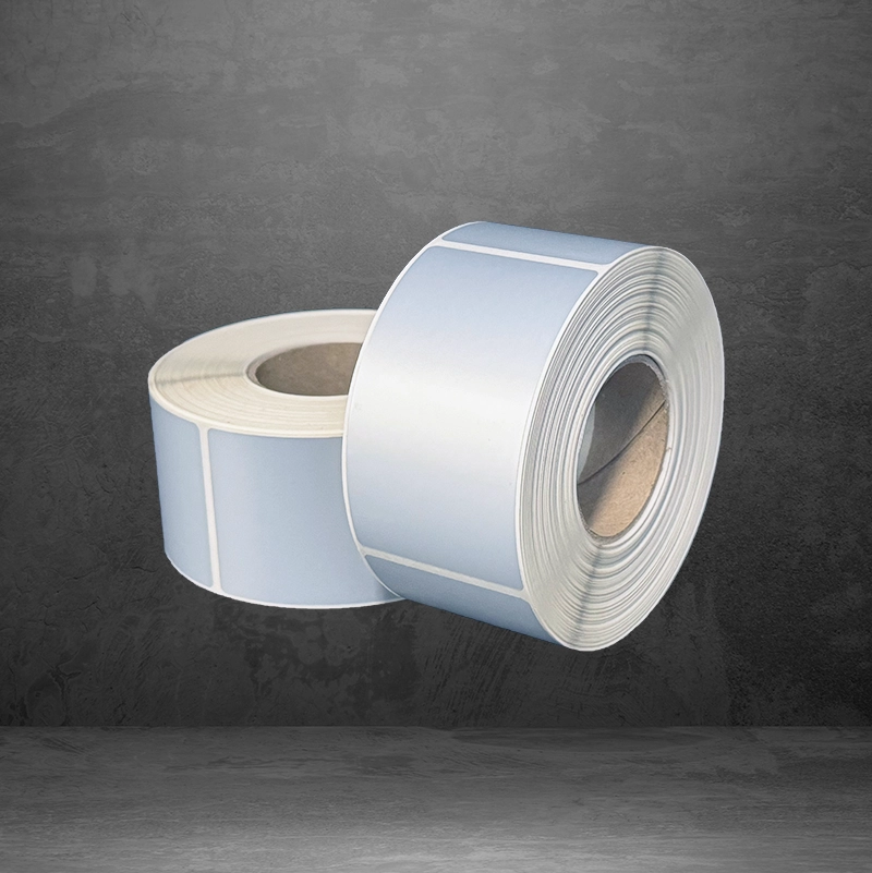 Tämän kilpitarran koko on 45 x 80mm ja sen tehty mattahopeasta polyesterista. Tarrassa on pysyvä liima. Yhdessä rullassa on 500 tarraa ja keskiön koko on 41mm.