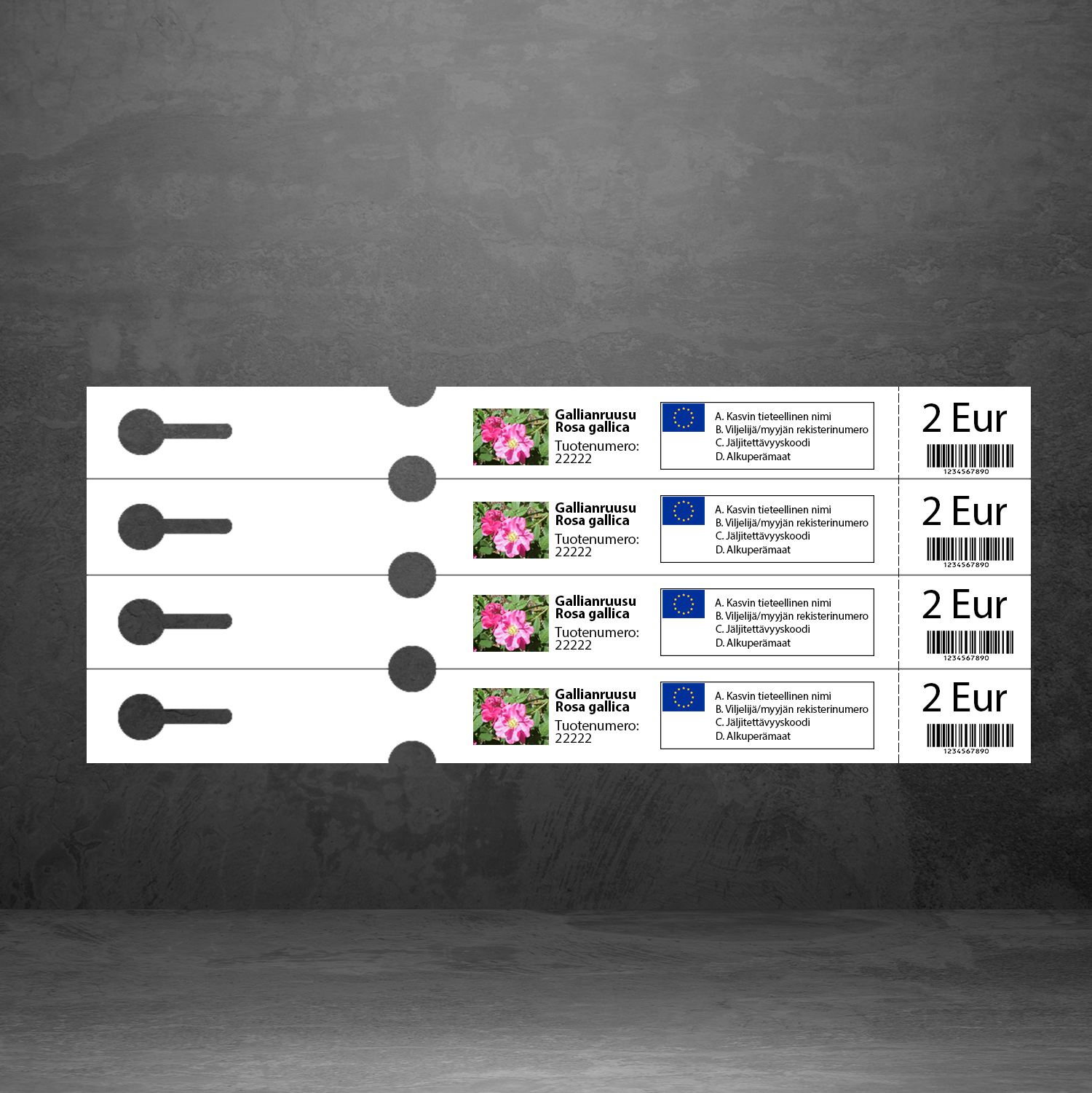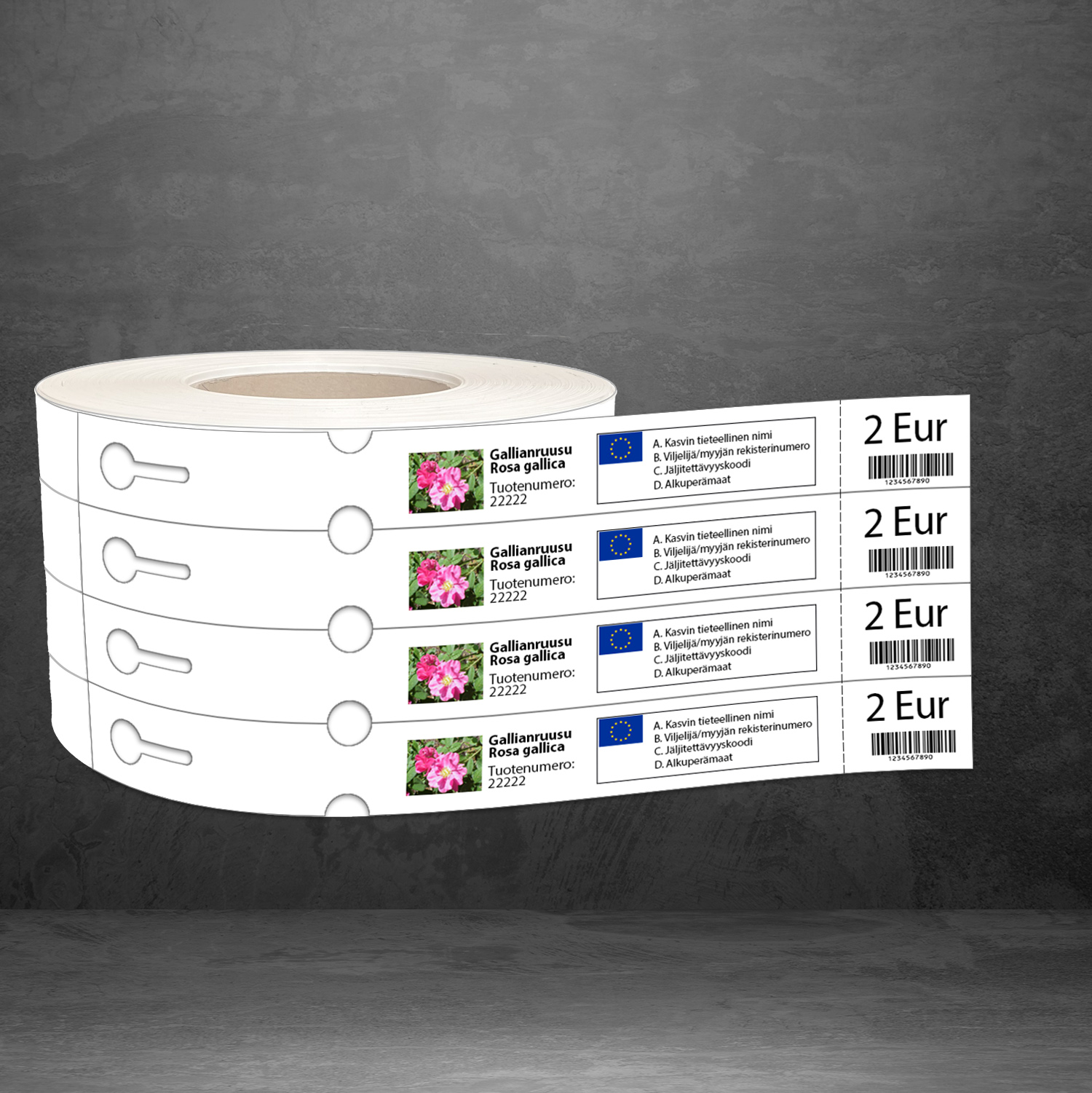 Kiiltävä 4-rinnan riippuetiketti. Etikettejä rullassa 2 000kpl.